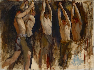 This is "Men at an Anvil," one of the homoerotic paintings of the Gilded Age, now on display at the Yale University Art Gallery. (the men are holding hammers, not hanging by their arms).